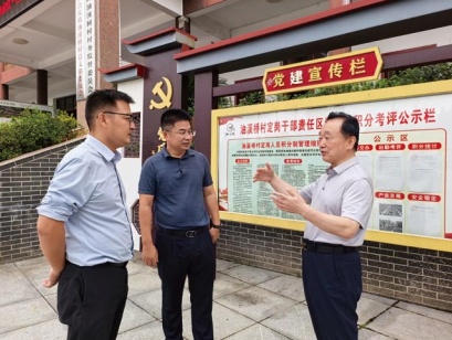 作者(左一)和油溪桥村党总支书记彭育晚(左二)在接待上级调研指导