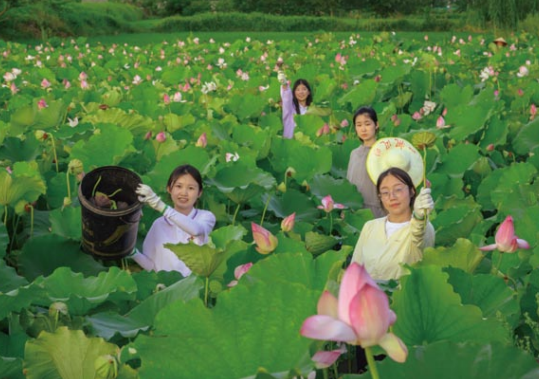 游客在采摘莲蓬
